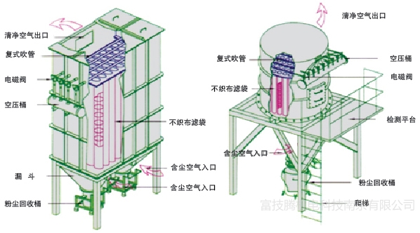 正常工作时,在系统风机的作用下,含尘气体吸入进气总管,通过各进气支管均匀地分配到各进气室,然后涌入滤袋,大量粉尘被截留在滤袋表面上,而气流则透过滤袋达到净化。净化后的气流通过袋室沿管路通过风机进入烟囱而排入大气。