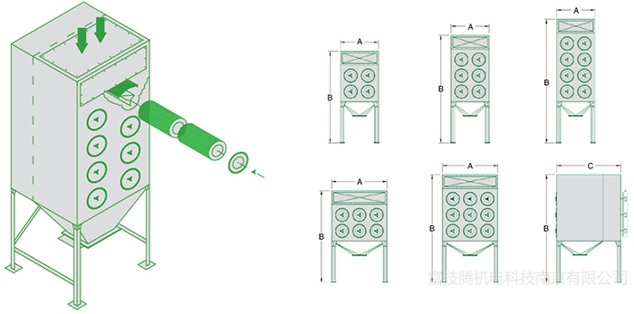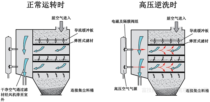 正常运行时,启动风机,含尘空气由顶部或前部入口进入集尘机,并通过滤筒过滤,粉尘则被捕集在滤筒外表面,清洁空气则经过滤筒中心进入清洁空气室,再经出口排出。